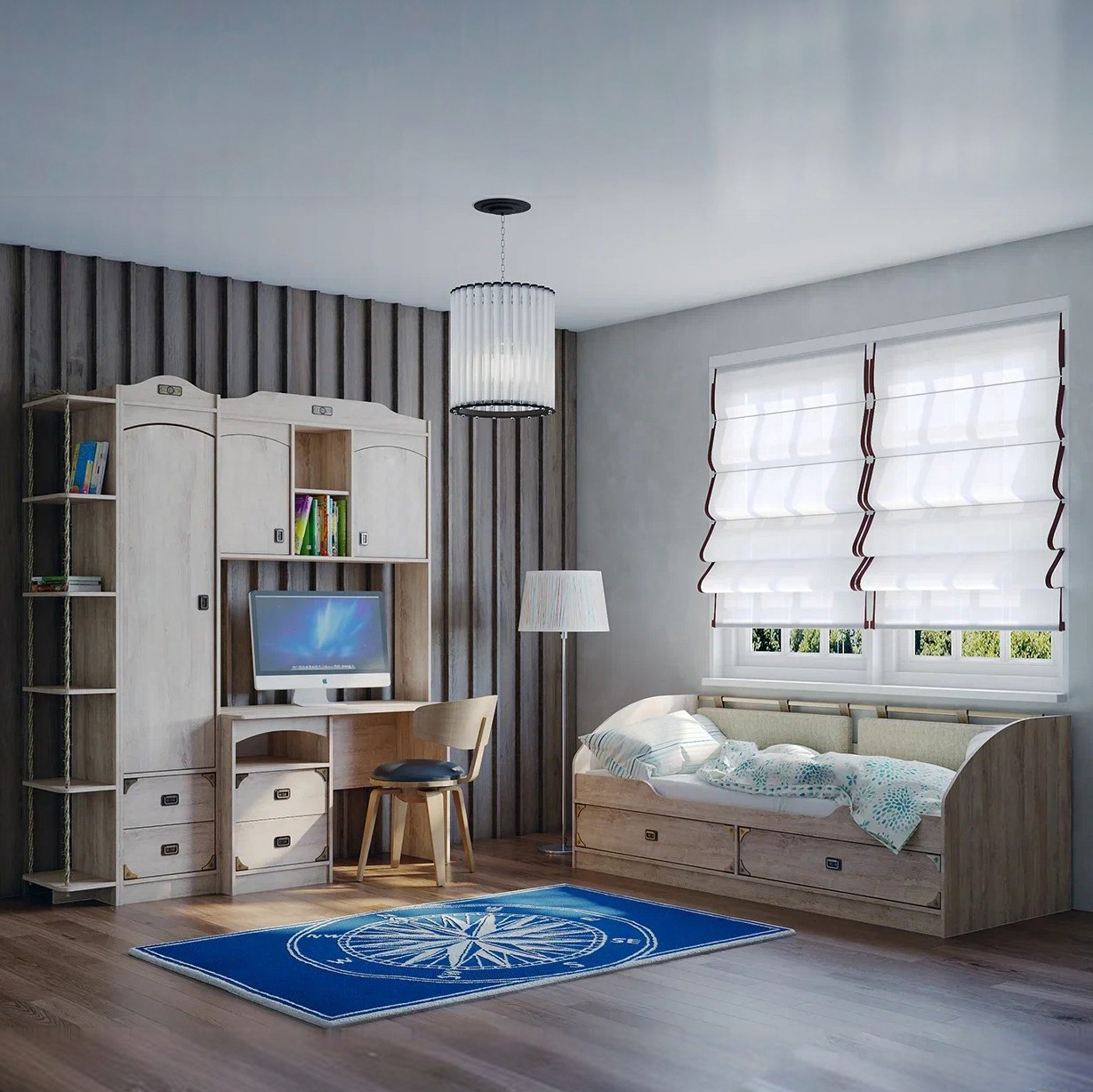 Комплект подростковой мебели МИРАЖ-1 - поражает оригинальным дизайном и дает волю фантазии. Функциональная мебель изготовлена из экологичного материала ЛДСП с древесным тиснением, выдержана в строгом сочетании белого и голубого цветов (дуб баррик). Комплектация модульной стенки позволяет комфортно обустроить учебное и спальное место, оставив пространство для занятий спортом и подвижных игр. Красивая морская тема искренний восторг у юного покорителя морских просторов. Но, возможно обладательницей этой красоты, станет девчонка, которая грезит о путешествии на белоснежном лайнере. Вместительный шкаф со стилизованными иллюминаторами, просторная кровать для отдыха, удобный стол, где можно делать уроки или играть в компьютерные игры и тумба с выдвижными ящиками в форме старинных сундуков. Комната напоминает кубрик на корабле, и мальчик с удовольствием будет проводить в ней все свободное время. такой комплект придает интерьеру настоящий морской стиль, а яркая цветовая палитра добавляет пространству солнечного света.