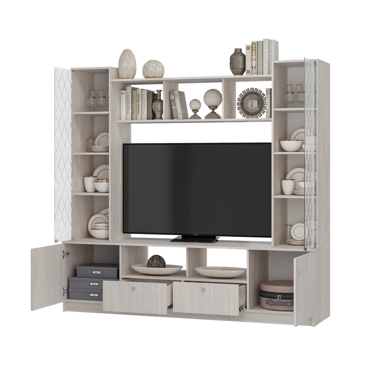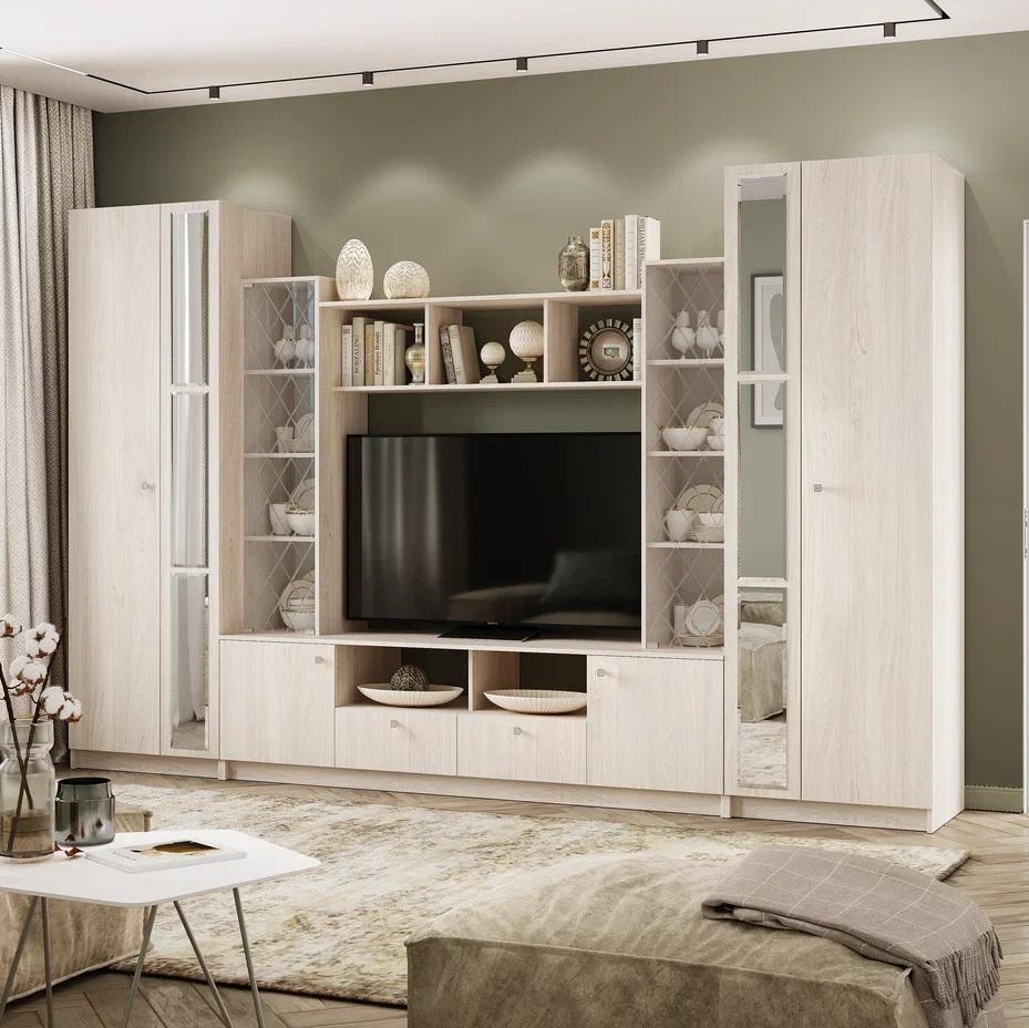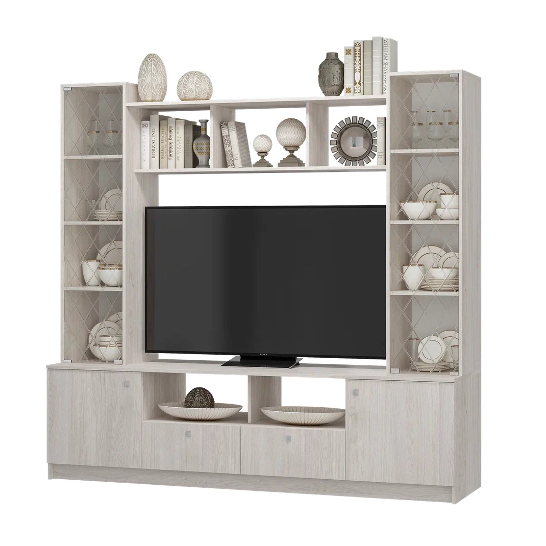 Элегантная Центральная секция ЗАРИНА ЦС-01 в декоре ясень белый преобразит вашу комнату, визуально расширяя пространство благодаря светлому оттенку фасадов. Эта современная стенка в гостиную с габаритами 2002х1910х536 мм выполнена из прочного ЛДСП и оснащена просторной нишей под ТВ 1300х928 мм для вашего домашнего кинотеатра. Конструкцию украшают изящные стеклянные створки по бокам, идеально подходящие для хранения посуды или сувениров. Если ваша цель — купить центральную секцию с продуманной системой хранения, модель ЗАРИНА станет лучшим выбором для вашего дома.