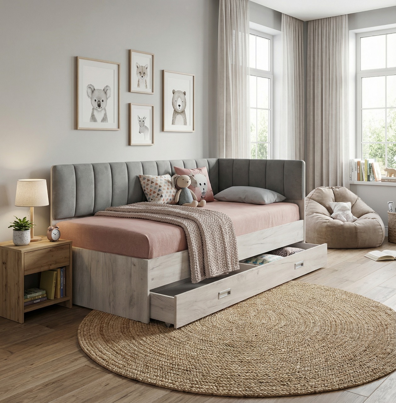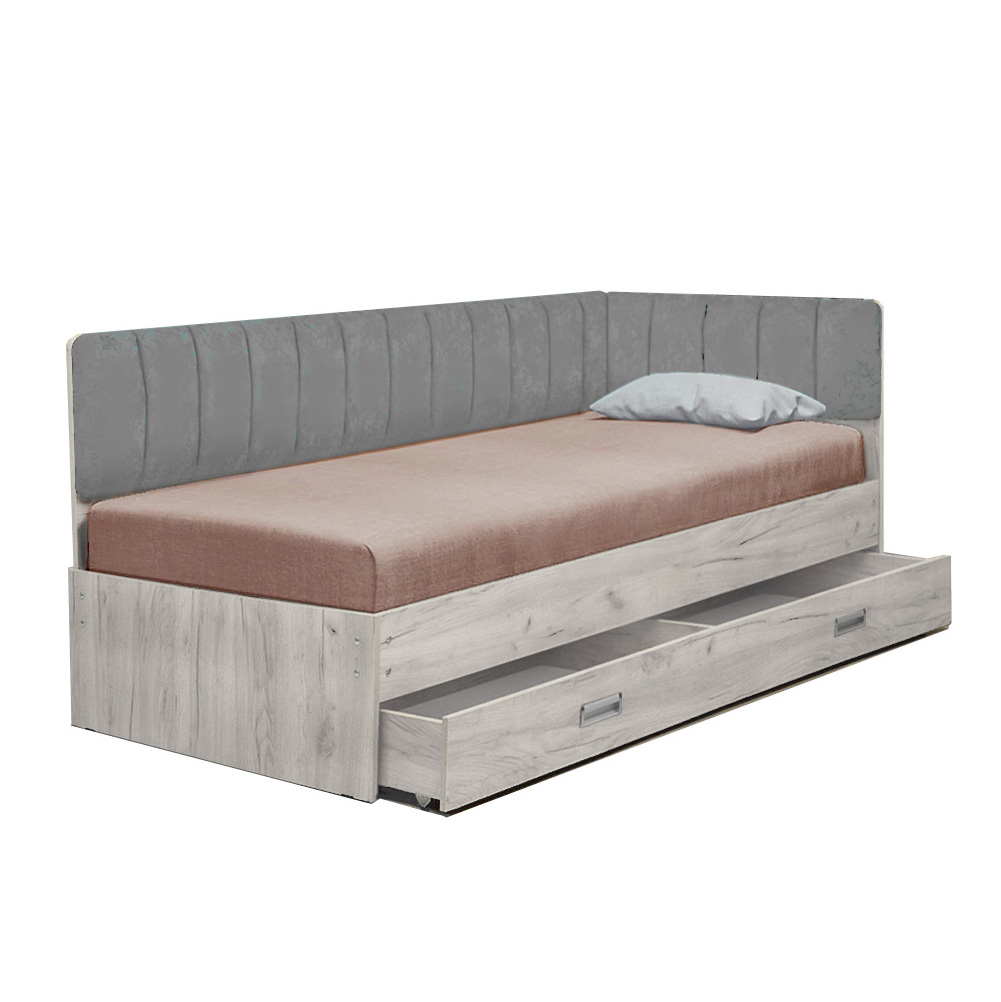 Современная кровать-15 с мягкими спинками правая в текстурном декоре дуб крафт белый и нежной обивке велюр светло-серый — это стильное и практичное решение для детской, подростковой или гостевой комнаты. Спальное место размером 900х2000 мм оборудовано надежным реечным основанием-ладе, которое обеспечивает правильный воздухообмен матраса и здоровый сон. Для рационального использования пространства под кроватью предусмотрен вместительный выкатной ящик на колесах-роликах, который удобно разделен на две независимые ниши для хранения постельного белья, сезонной одежды или игрушек. Если вы планируете купить кровать 90х200 с ящиком, которая гармонично дополнит светлый современный интерьер, эта практичная односпальная кровать с мягким изголовьем подарит непревзойденный уют и поможет поддерживать идеальный порядок.